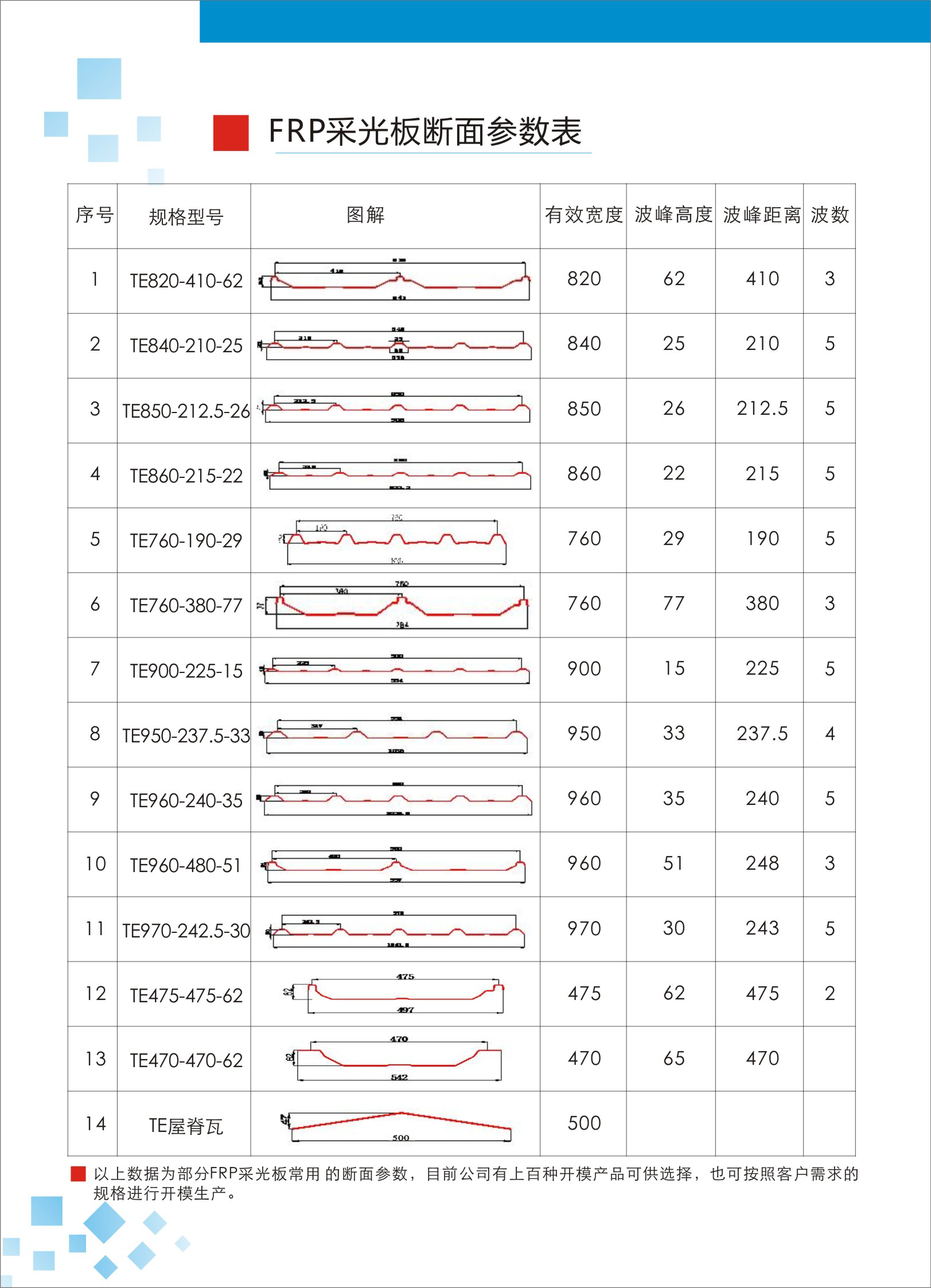 斷面形式 | (1)通用瓦型:760角馳瓦(俗稱暗扣)通用采光瓦、820角馳瓦(俗稱暗扣)通用采光瓦、840型、900型、980型、475型、1050型 TE屋脊瓦500型 (2)80MM-120MM寬FRP采光平板 (3)開模生產(chǎn)定制型號 | ||